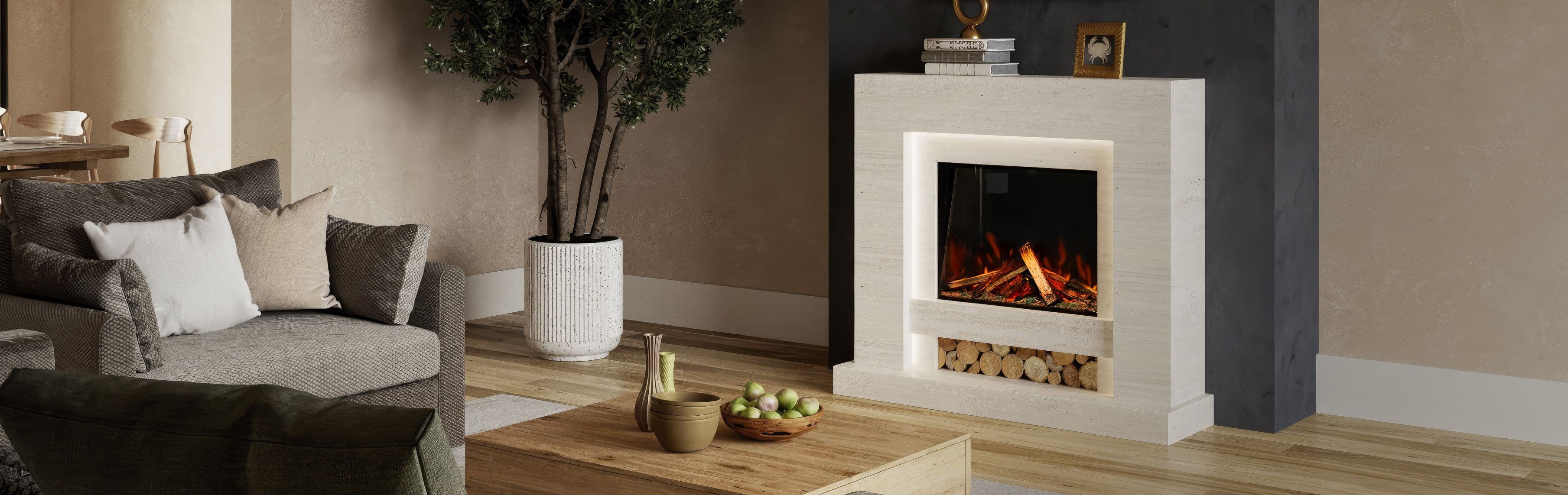 What sets The Aspen Suite apart is it features authentic, hand-finished British logs that introduce subtle natural character. The timber logs sit in the lower recessed log store beneath the fire bringing texture and modern design. Their warm, rustic aesthetic enhances the suite’s clean, modern lines, making it a standout feature in any home.