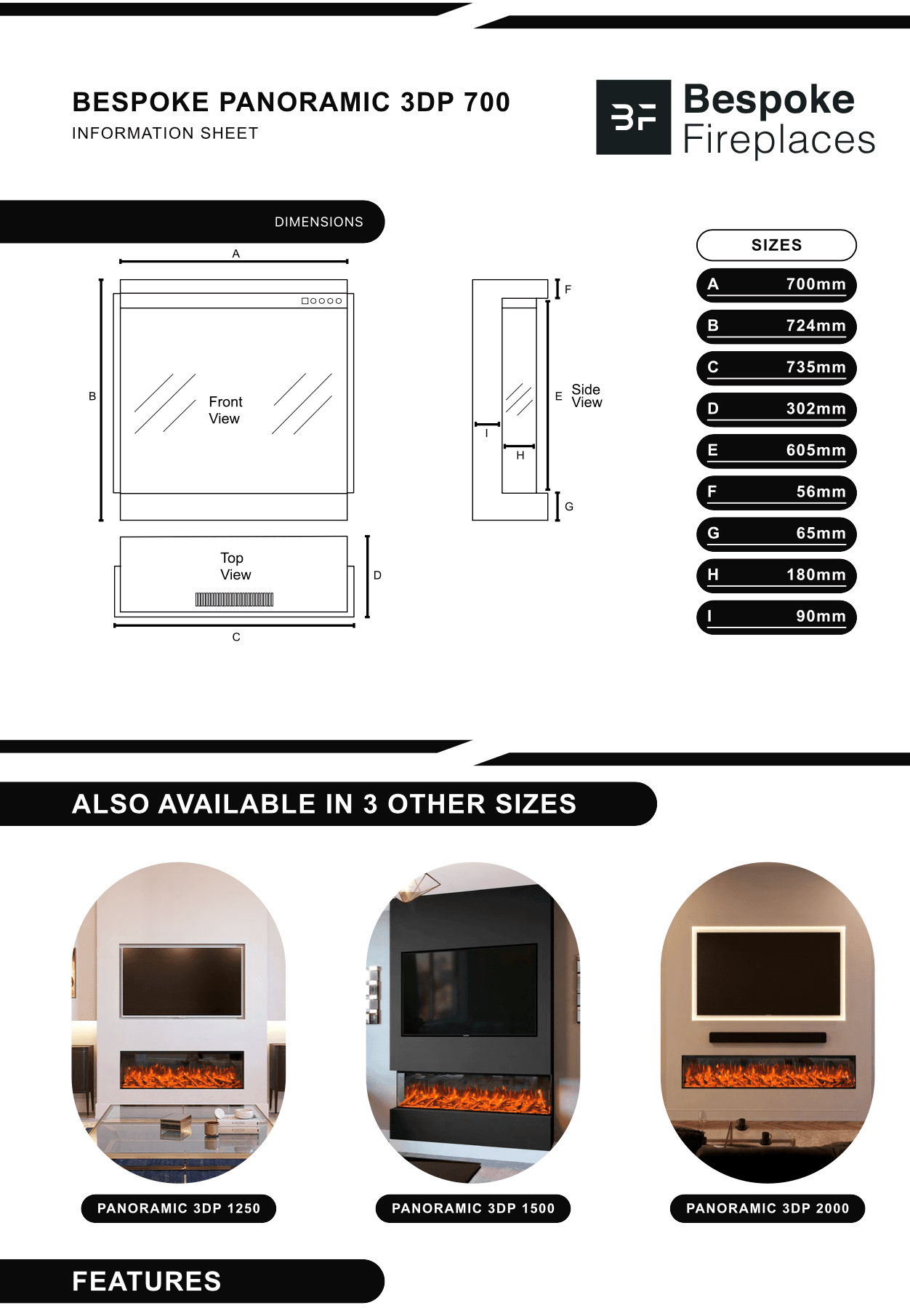 Introducing the Bespoke Panoramic 3DP 700, a revolutionary addition to our electric fireplace range. Immerse yourself in a three-dimensional viewing experience like never before. The 3D screen enhances the visual appeal, creating a lifelike representation of flames that dance and flicker, providing an unparalleled ambiance in your living space.